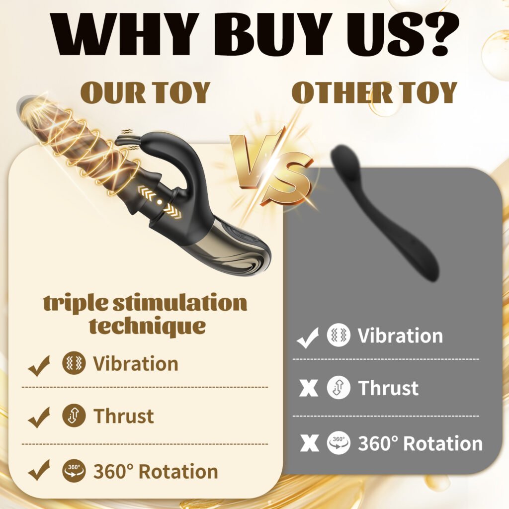 Just as the name indicates, the tornado swirl rabbit has a shaft that can truly swirl up and down, just like the tornado movement. It can thrust up and down and rotate 360° around its axis at the same time. With the perfect combination of thrusting and rotating, the shaft can fully touch every corner of vagina, making even the strongest women kneel down!